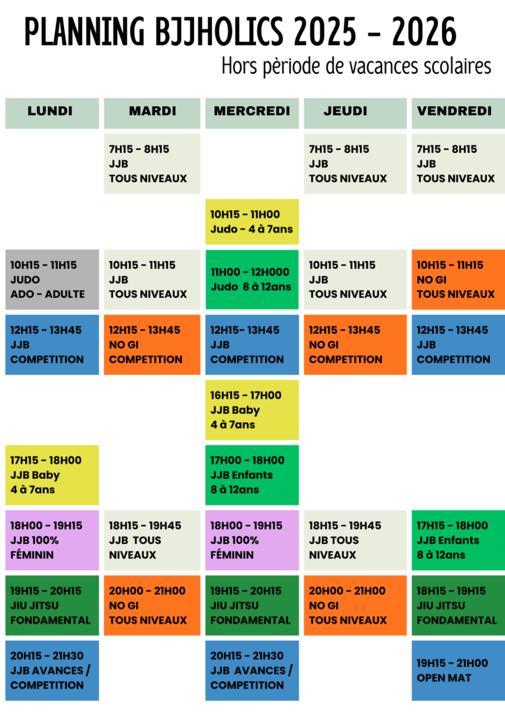 Les cours d’essai sont possibles sur les cours de « jiu-jitsu fondamental » et « JJB tous niveaux ». Contactez-nous pour planifier le votre !